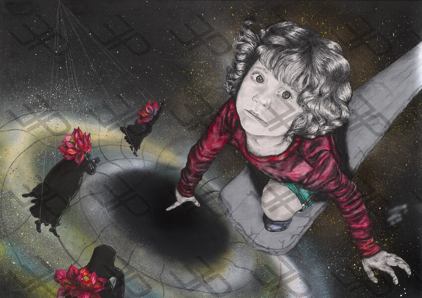 A small child with a despairing expression points to the centre of a black hole in the middle of nowhere. He almost pinches the singularity lurking in the centre with his little fingers. At the same time, it rests on a beam that extends beyond the composition's boundaries, towards an unspecified cosmic point. It stands high in the absolute void, where the determination of the direction is nothing but a pointless convention. It represents the feelings of the man who is alone, without support and without hope in an unpredictable world, full of enigmatic and shadowy enemies.